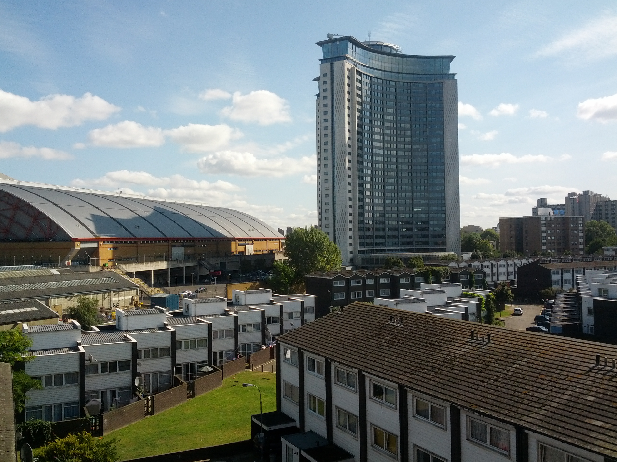 Empress State Building, a large curved glass tower in West London, standing over surrounding residential housing The Empress State Building stands 117 meters tall and has been part of London’s skyline since the late 1960s. It was originally built as an office tower, but over the years it has been upgraded and reshaped, including a full refurbishment in the early 2000s that gave it a sleeker, more modern top.