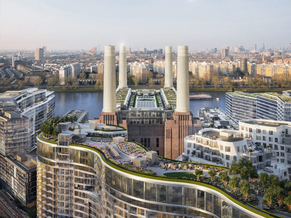 Battersea Power Station in London, surrounded by modern riverside residential developments and a rooftop garden Part of the huge redevelopment around Battersea Power Station, Battersea Roof Gardens rises around 100 meters and brings a softer, greener look to the area.