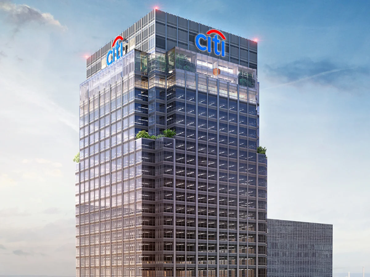 The top of the Citigroup Centre skyscraper in Canary Wharf, London, featuring the large blue Citi logo against a bright sky Also standing at 200 meters, Citigroup Centre is the twin of the HSBC Tower. Completed in 2001, it helps frame One Canada Square in the skyline. Together, the two towers show how Canary Wharf became a major home for global banks in the early 2000s.