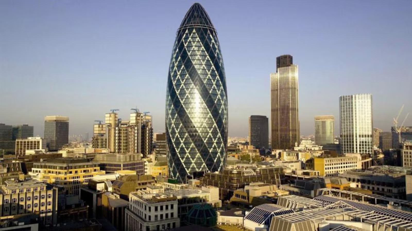 Cityscape showing multiple high-rise glass towers and the unique Gherkin building design At 160 meters, the Walkie-Talkie is best known for its unusual shape and its early mistake. During construction, the curved glass acted like a giant magnifying glass and melted parts of cars. After adding a sunshade, the problem stopped, and the building gained a new purpose.