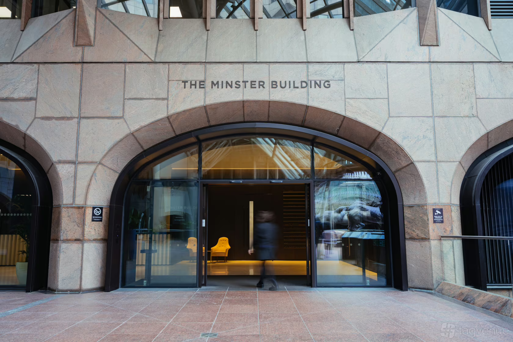 Main entrance of The Minster Building in London, featuring a large stone archway and glass doors The Minster Building is a unique presence in the City of London. Completed originally in the 1990s and redesigned in the late 2010s, it rises around 68 meters and has a bold, stepped façade with neo-gothic touches.