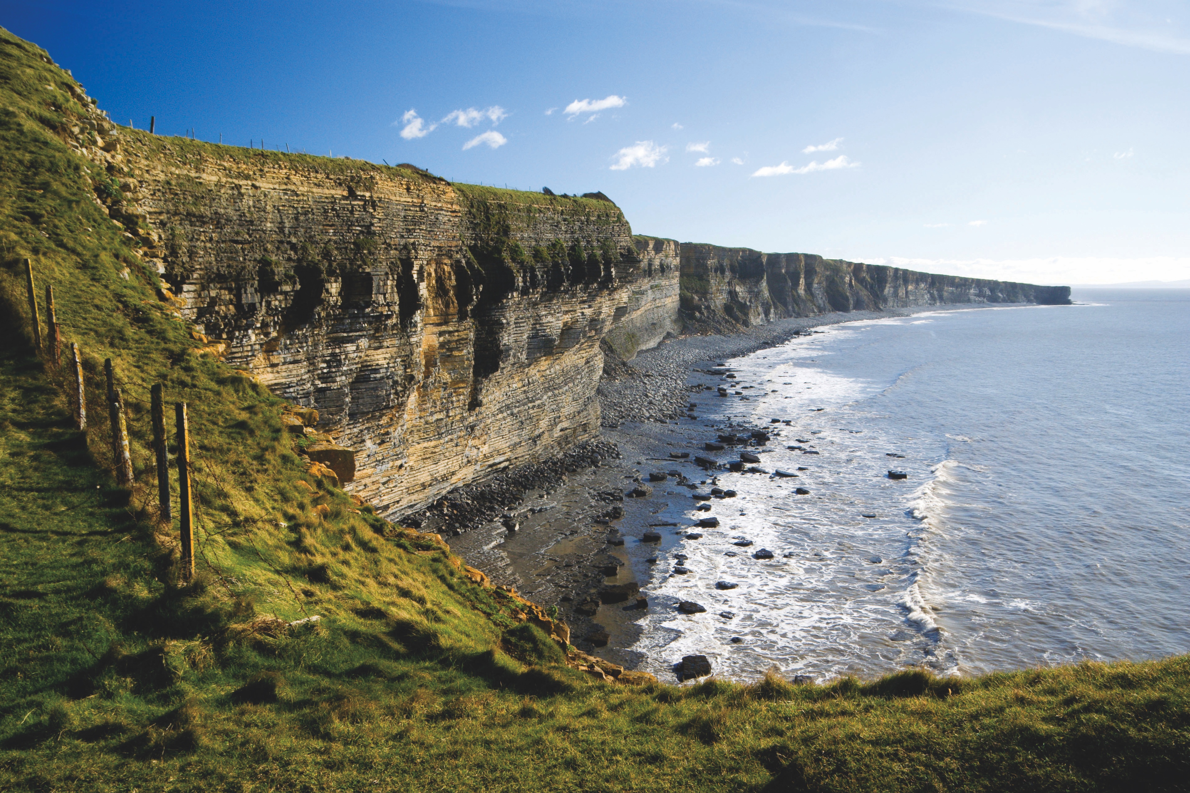 Rocky sea cliffs along grassy coastline under blue sky West of Cardiff, the region exhales. The Glamorgan Heritage Coastis where South East Wales swaps stone for sky: cliff paths, sea views across the Bristol Channel, and sections of the Wales Coast Path that feel surprisingly wild given how close you still are to the capital. One of the most satisfying stretches runs around Llantwit Major toward Nash Point, with fossil-rich beaches and headlands that make a half-day outing feel like a proper change of scene.