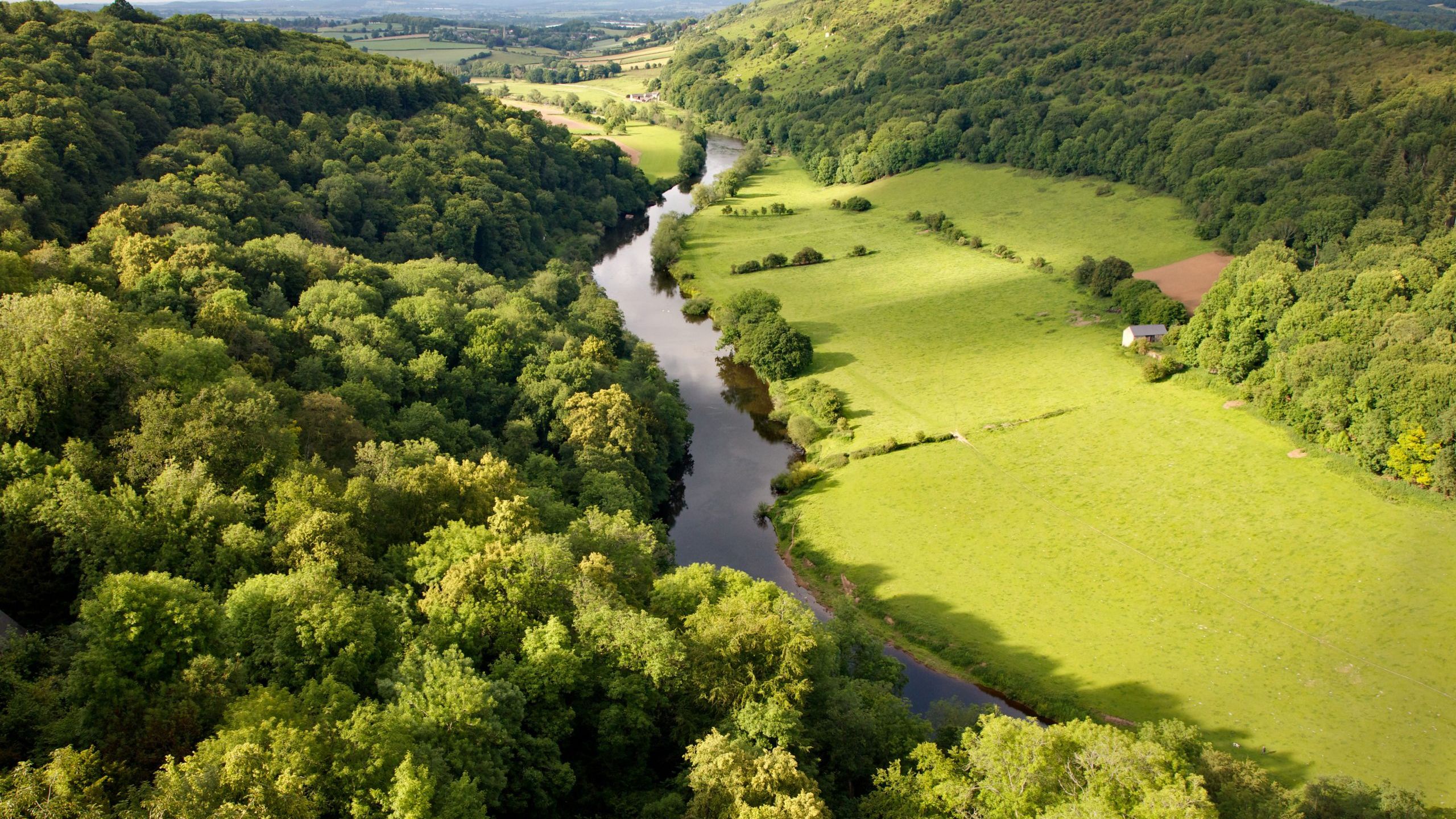 River winding through green valley and wooded hills The River Wye forms a natural border, winding through limestone gorges that sparked the Picturesque tourism movement in the 18th century.
