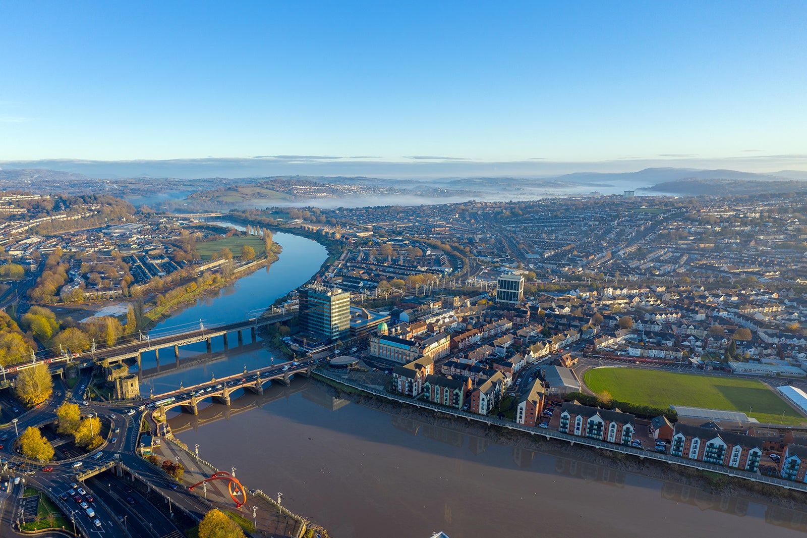 Aerial view of city with river and bridges Newport, Cardiff’s neighbour to the east, is often bypassed, but it holds two sites of global significance.