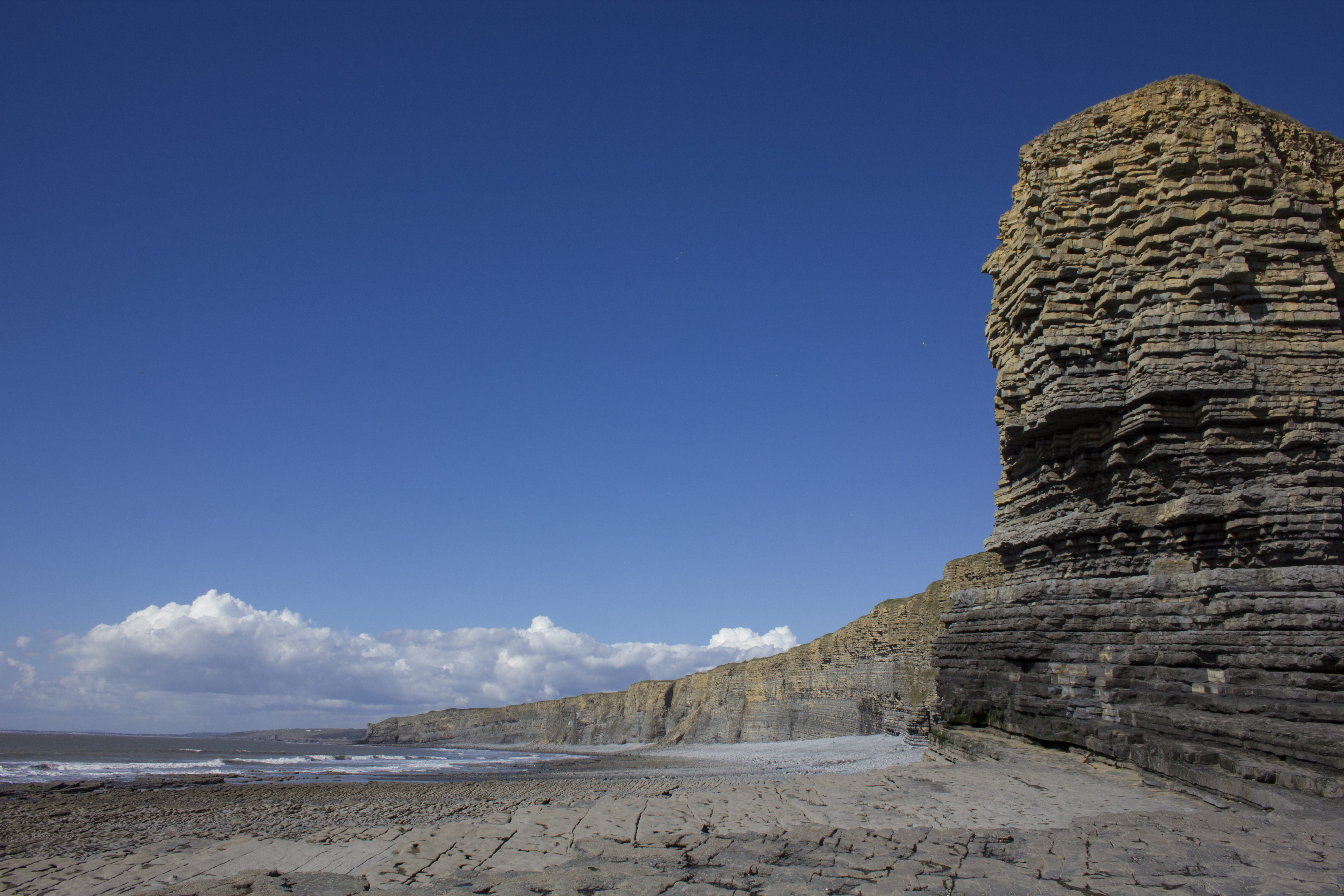 A wide coastal scene with layered limestone cliffs West of Cardiff, the industry fades into the Vale of Glamorgan. This is the garden of the coast. The Heritage Coast stretch near Llantwit Major offers cliffs that rival the Jurassic Coast, layered with Liassic limestone. It’s a perfect antidote if the city noise gets too much.