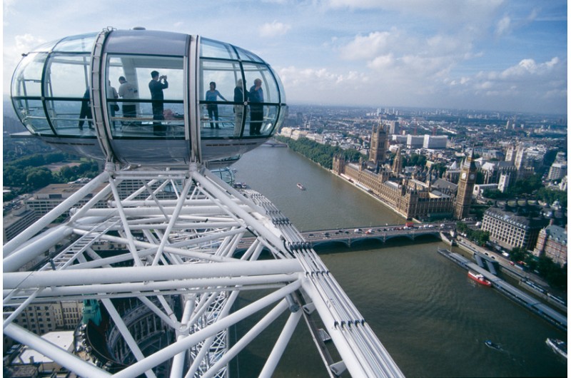 Tourists stand inside a spacious glass London Eye pod, taking photos and enjoying the panoramic view of the London cityscape When I’ve ridden the Eye on a clear day, I’ve been able to pick out many of London’s most famous landmarks. From high above, everything feels connected.