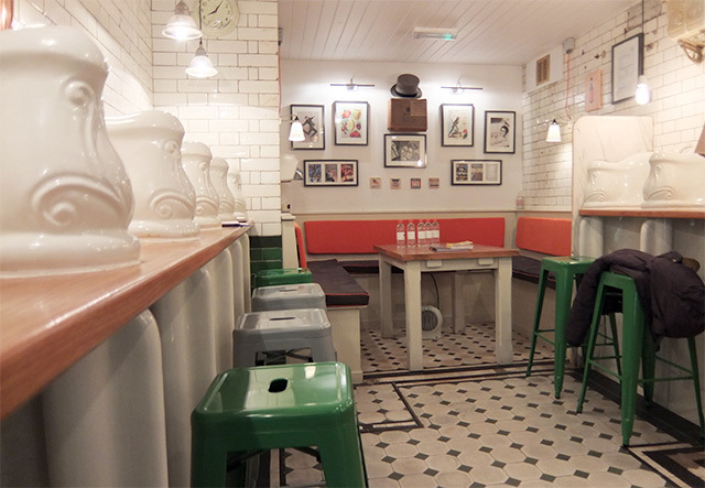 You’ll find yourself sitting at restored porcelain urinals (cleaned and repurposed, of course), surrounded by green tiles and vintage fixtures that give the place an unmistakably quirky charm.