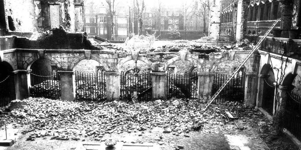 The Abbey during World War II, showing destroyed walls, debris, and structural damage from The Blitz The Abbey survived World War IIlargely intact, though it suffered damage during the Blitz. Some of the Abbey's most precious artifacts and funeral effigies were moved to Piccadilly Tube Station for safekeeping during air raids. Daily worship continued throughout the war, even during the darkest days when German bombs fell on London. The Battle of Britain Chapel in the RAF Chapel commemorates the airmen who defended Britain during those crucial months in 1940. The chapel's stained glass windows incorporate the badges of the fighter squadrons that fought in the battle.