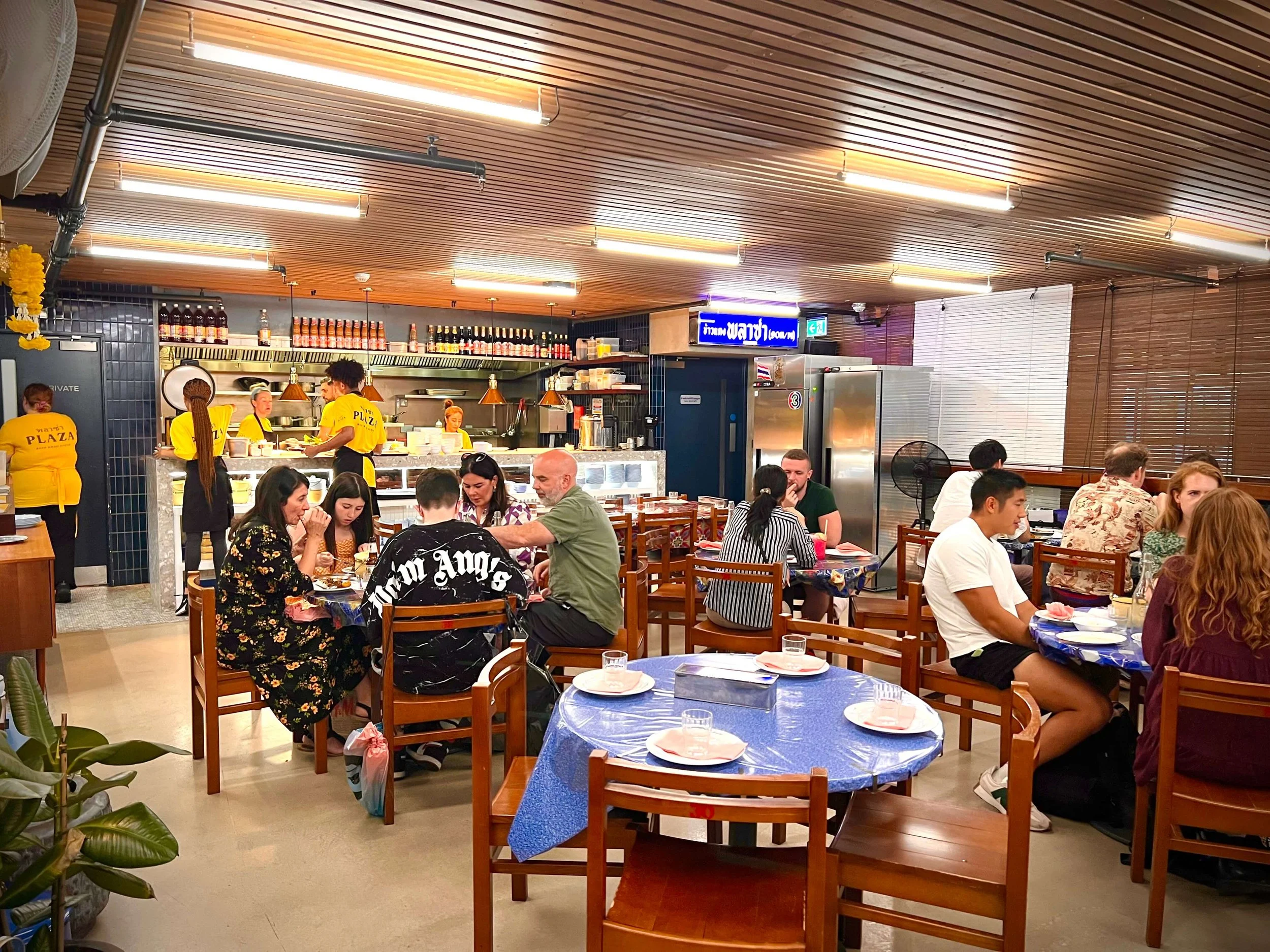 Plaza Khao Gaeng Thai restaurant showing customers dining and kitchen staff in yellow shirts I’m always happy to find a cheap place in a tourist-heavy area, and Plaza Khao Gaeng is exactly that. It’s Thai canteen-style food: quick, filling, and full of flavour. You pick from trays of curry and rice, and you’re eating in minutes.