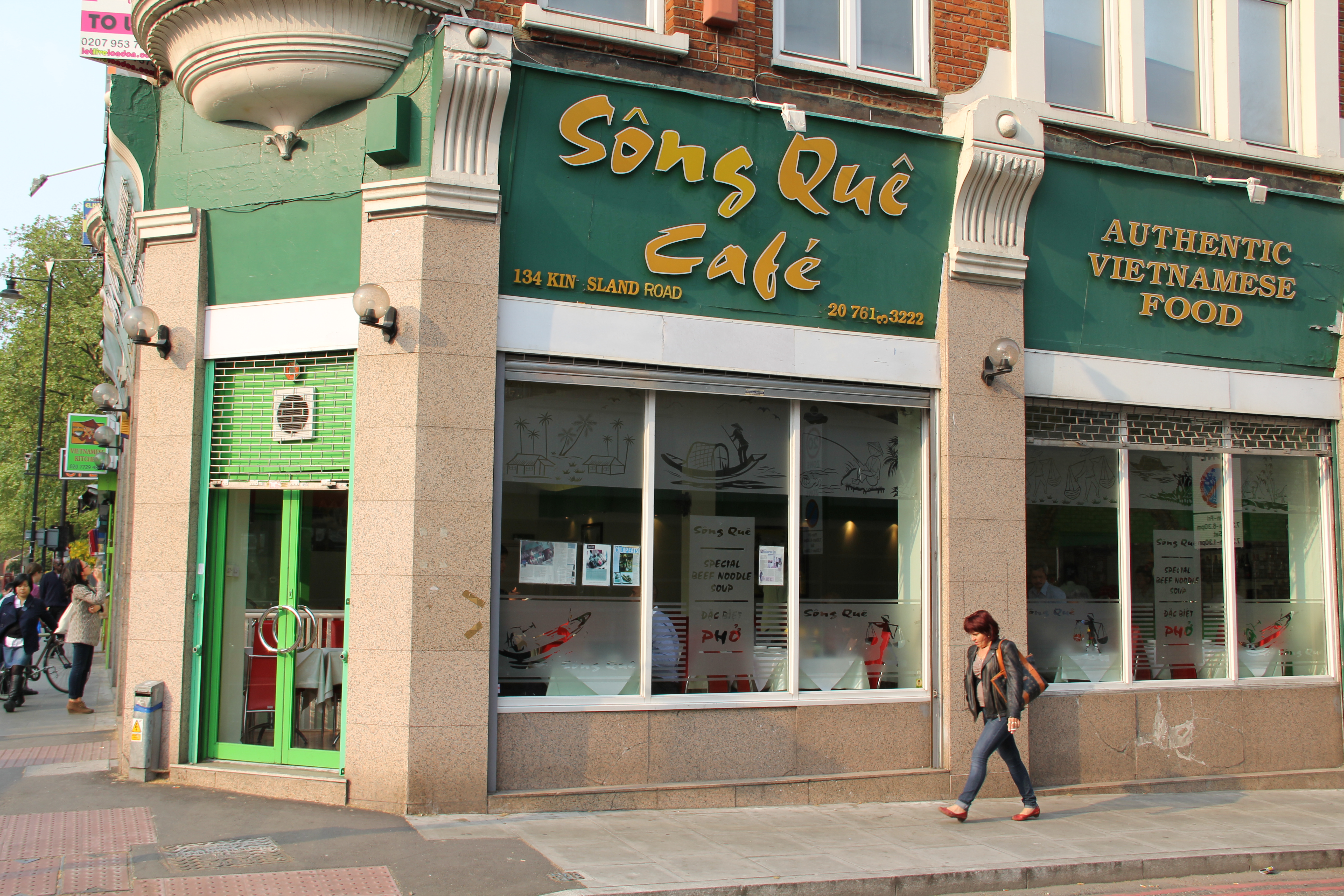 Restaurant Sông Quê Café showing large windows and a woman walking past the storefront Song Que is simple, honest Vietnamese food at great prices. It doesn’t try to be fancy. You come here because the bowls are big, the flavours are strong, and the cost makes sense.