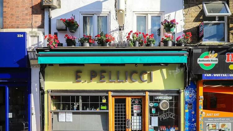 E. Pellicci cafe building on a London street with neighboring businesses and brickwork E. Pellicci is a proper old-school London café, and I love it. It feels like stepping into another time colourful inside, friendly staff, and big plates that don’t try to be fancy. It’s one of my favourite places for a cheap meal that still feels full of character.