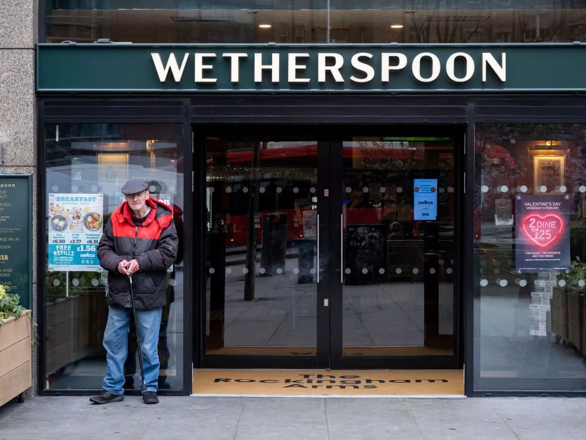 Man with a walking stick standing in the doorway of a Wetherspoon pub with clear reflections of a city bus Wetherspoons isn’t trendy, but for price it’s hard to beat. I use it for a cheap breakfast, a quick lunch, or food before a night out when I don’t want to spend much. The menus are huge, so there’s always something that works.