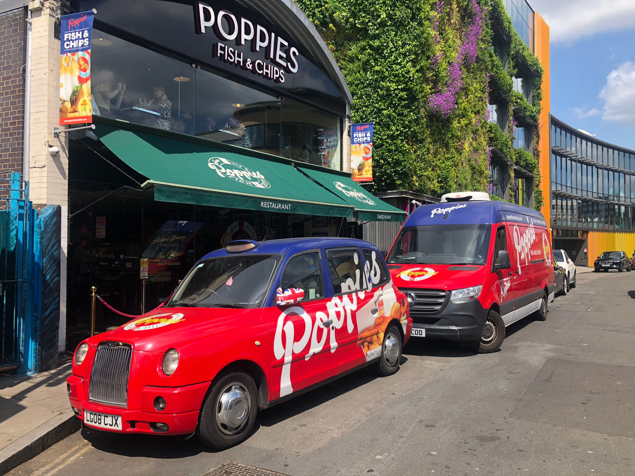 Storefront of Poppies Fish & Chips with a green awning on a sunny day Fish and chips can be expensive in London, so I go to Poppies when I want one that feels truly worth it. It has an old-school, friendly vibe, and the fish is cooked fresh, not sitting around waiting for someone to order.