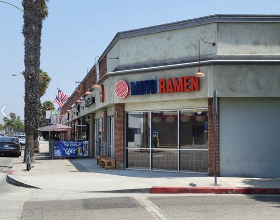 Moto Ramen restaurant storefront with a red and blue sign, located in a sunny commercial strip mall with palm trees Ramen Moto is my cheap ramen option when I’m north. The bowls are rich, filling, and priced better than most central ramen spots. It’s a simple place, but that’s part of why it stays good value.