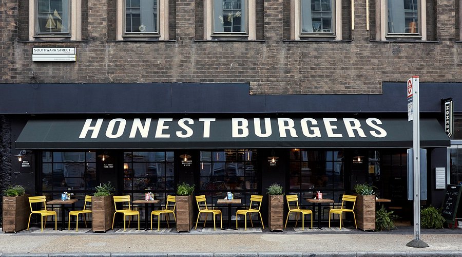 Modern burger restaurant facade, Honest Burgers, with outdoor dining setup I like Honest because it keeps things simple and fair. You get a proper, juicy burger made with good meat, but the price doesn’t feel silly for London. The restaurants are casual and relaxed, so it’s easy to walk in hungry and leave happy.