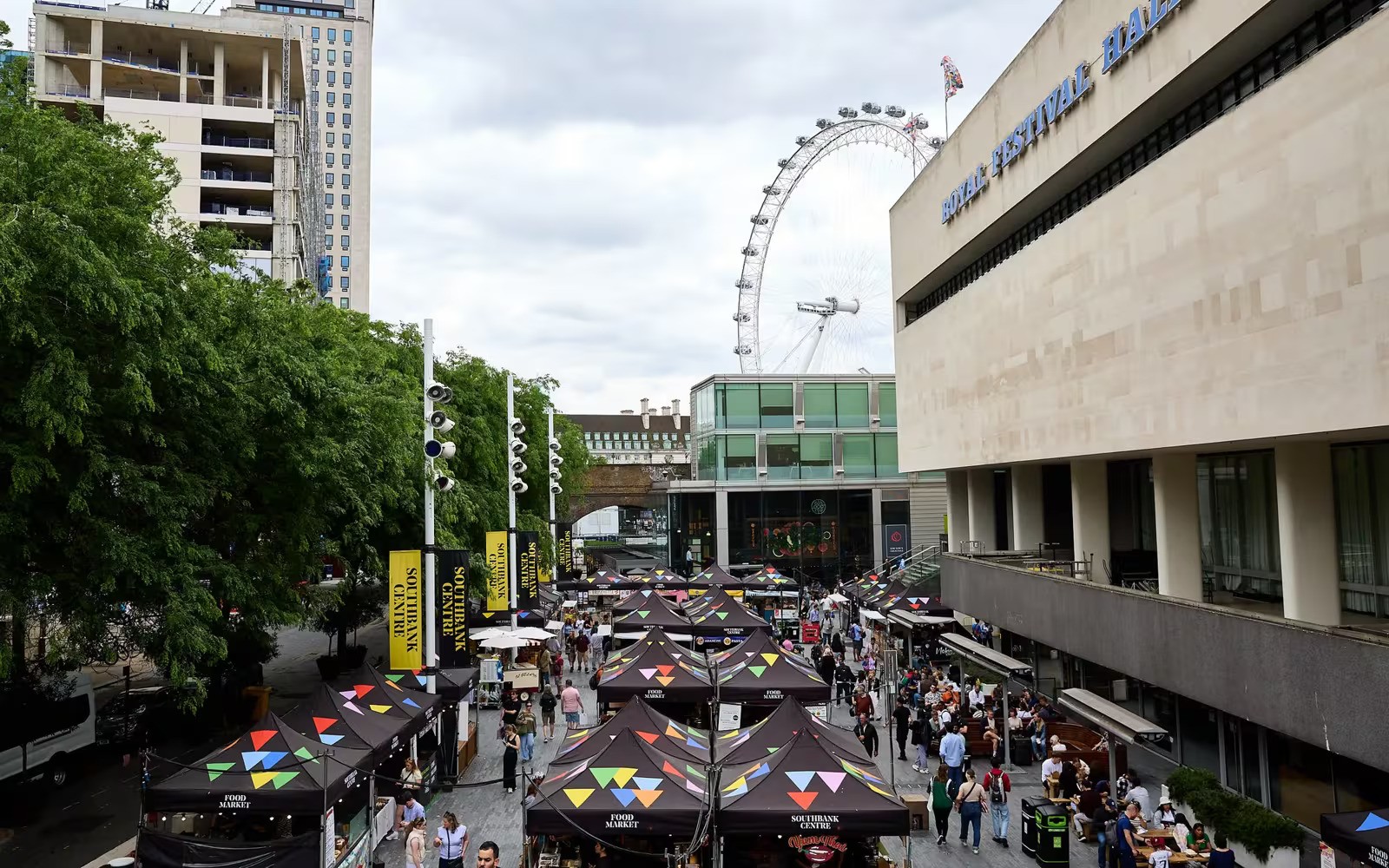 Southbank Centre Food Market in London with many black stalls and the London Eye visible in the background I love this market for a cheap weekend meal with a walk by the river. It has that relaxed London weekend feel, and most stalls offer decent portions for fair prices.