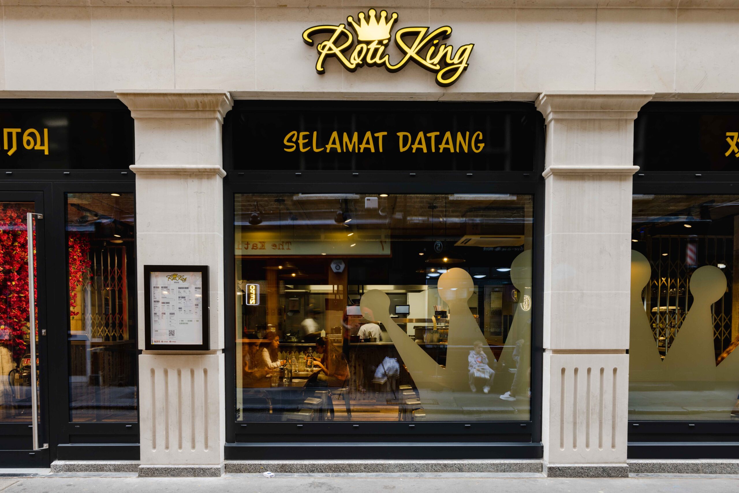 Malaysian street food restaurant Roti King storefront with black frame windows and gold lettering Hidden down a basement staircase near Euston Station, Roti King is where I go when I'm craving proper Malaysian street food. The owner, Sugen Gopal, grew up in his mother's restaurant kitchen in Malaysia, and it shows in every dish.