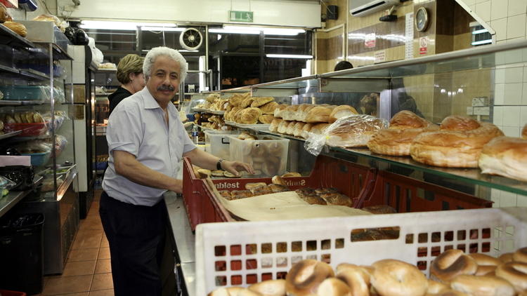 Baker standing behind a counter filled with fresh bagels and bread inside Beigel Bake shop This place is open 24 hours a day, 7 days a week, and I've been here at all hours. Their salt beef beigel (that's how they spell bagel) costs around £5 and is one of London's legendary cheap eats.