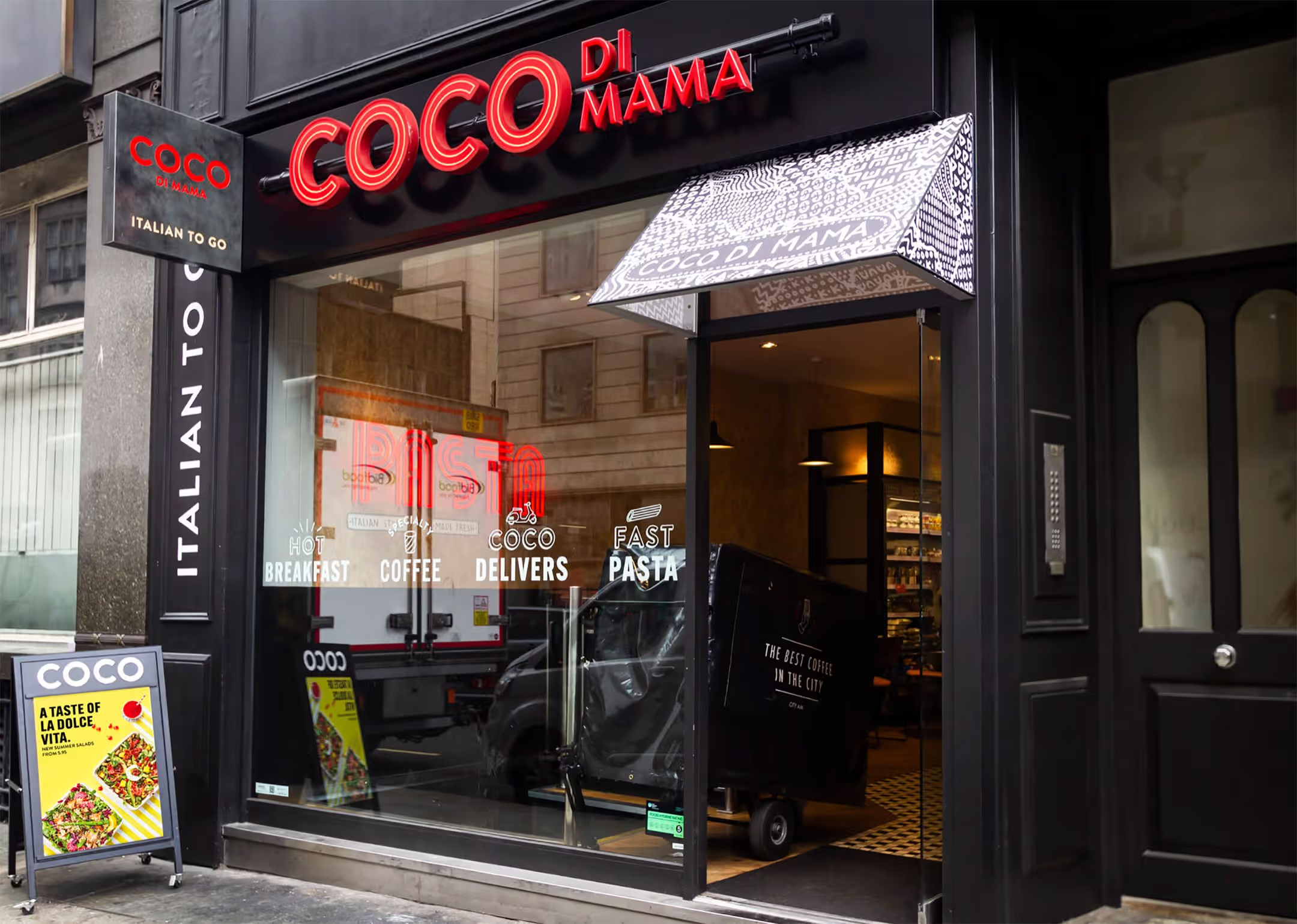 Shopfront of Coco Di Mama restaurant advertising fast pasta, hot breakfast, coffee, and delivery services Coco di Mama is my cheap, fast pasta fix when I’m in central London and don’t want to spend time hunting for food. It’s casual, quick, and the pasta pots are filling for the cost.
