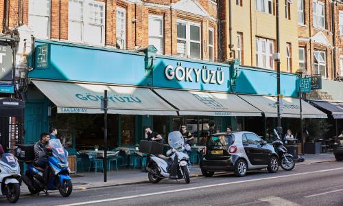 Gokyuzu restaurant entrance displaying the large logo sign and a row of cream sun awnings covering the patio are Green Lanes is where I go when I want low-cost Turkish food that fills you up properly. There are several good spots here, and places like Gokyuzu are known for huge platters of grilled meat, bread, dips, and salads.