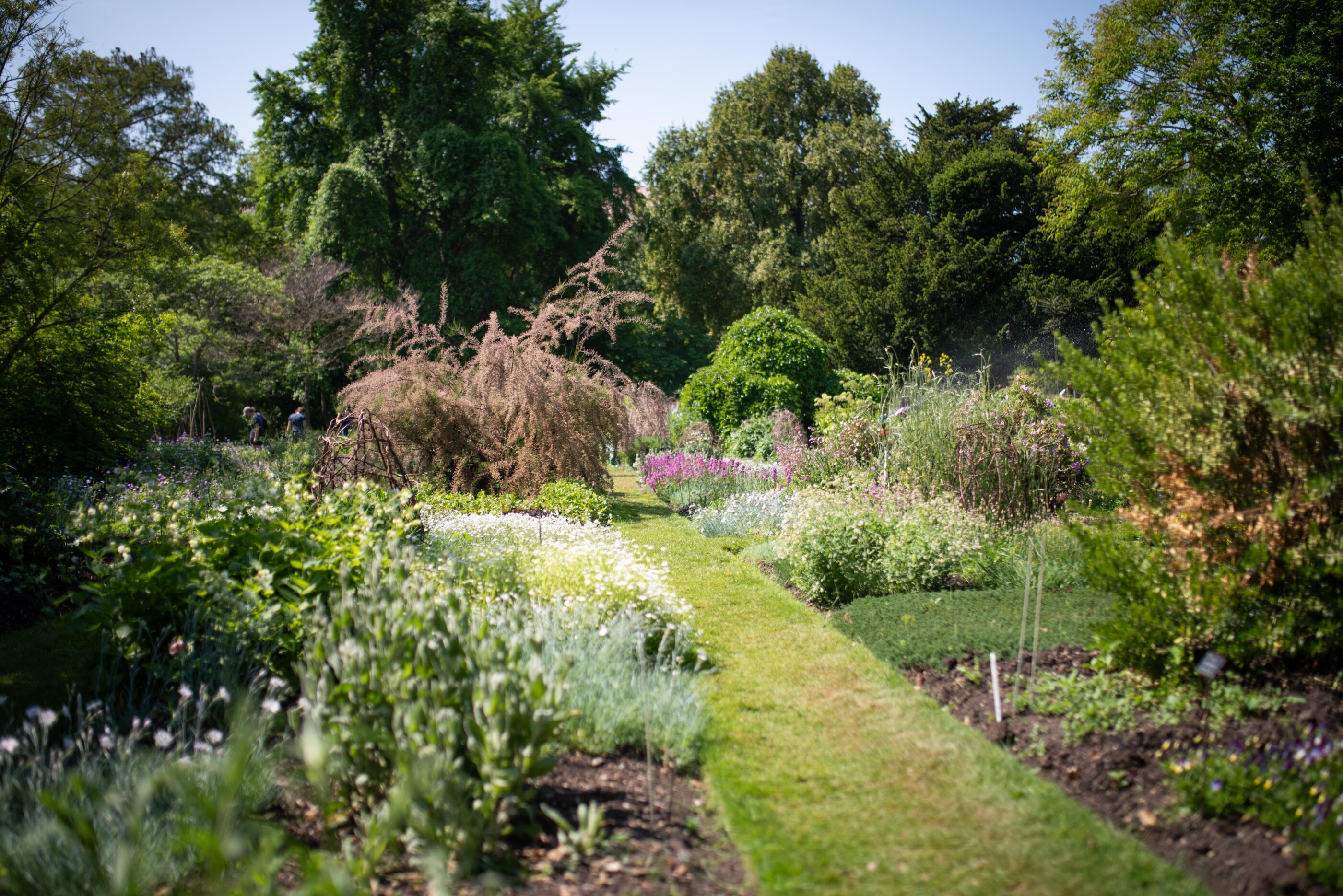 Grassy walkway between colorful flower beds under trees Founded in 1673, this walled garden in Chelsea was created by the Society of Apothecaries to grow medicinal plants. Today it holds 5,000 plant species arranged in themed beds: medicinal, edible, useful, and historically significant plants.