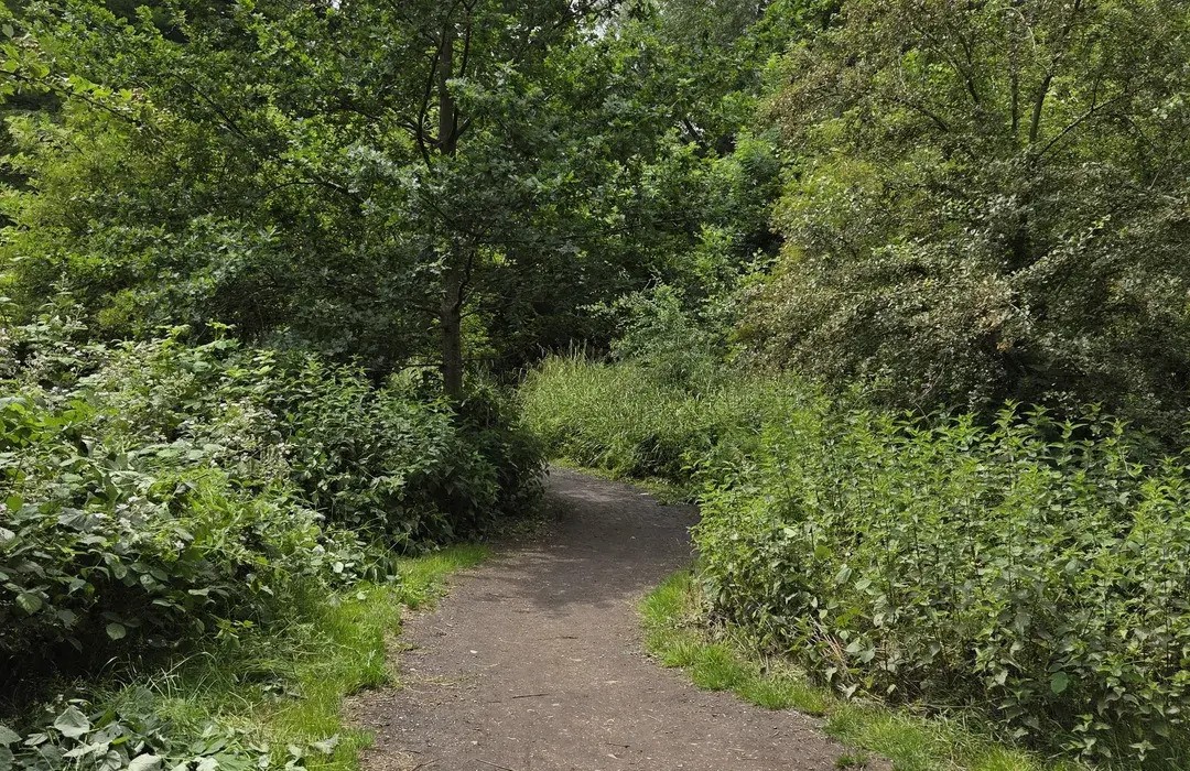 Winding dirt path through dense green forest undergrowth at the Wandle Trail The River Wandle flows through south London from Croydon to the Thames at Wandsworth. The Wandle Trail follows the river for 12.5 miles through parks, nature reserves, and industrial heritage sites. The river valley creates its own microclimate and ecosystem. Kingfishers frequent the cleaner stretches, while old mill buildings add historical interest.