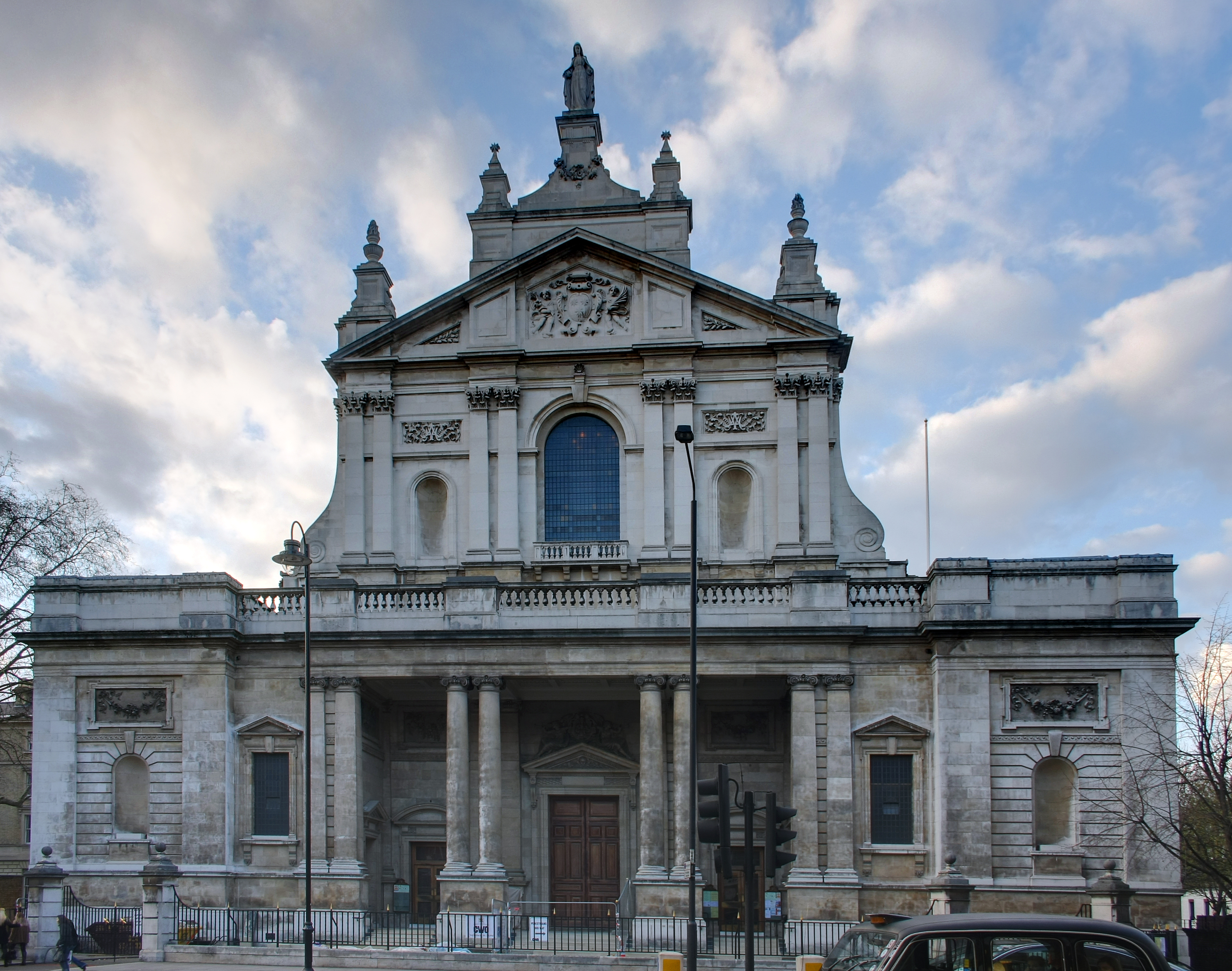 Grand white stone building with columns and a statue on top at the Brompton Oratory This ornate Italian-style church near South Kensington opened in 1884. The baroque interior features numerous side chapels where visitors can sit in relative privacy despite the church's size. The Oratory holds regular services, but between them, the space offers a grand yet peaceful environment. The scale impresses without overwhelming.
