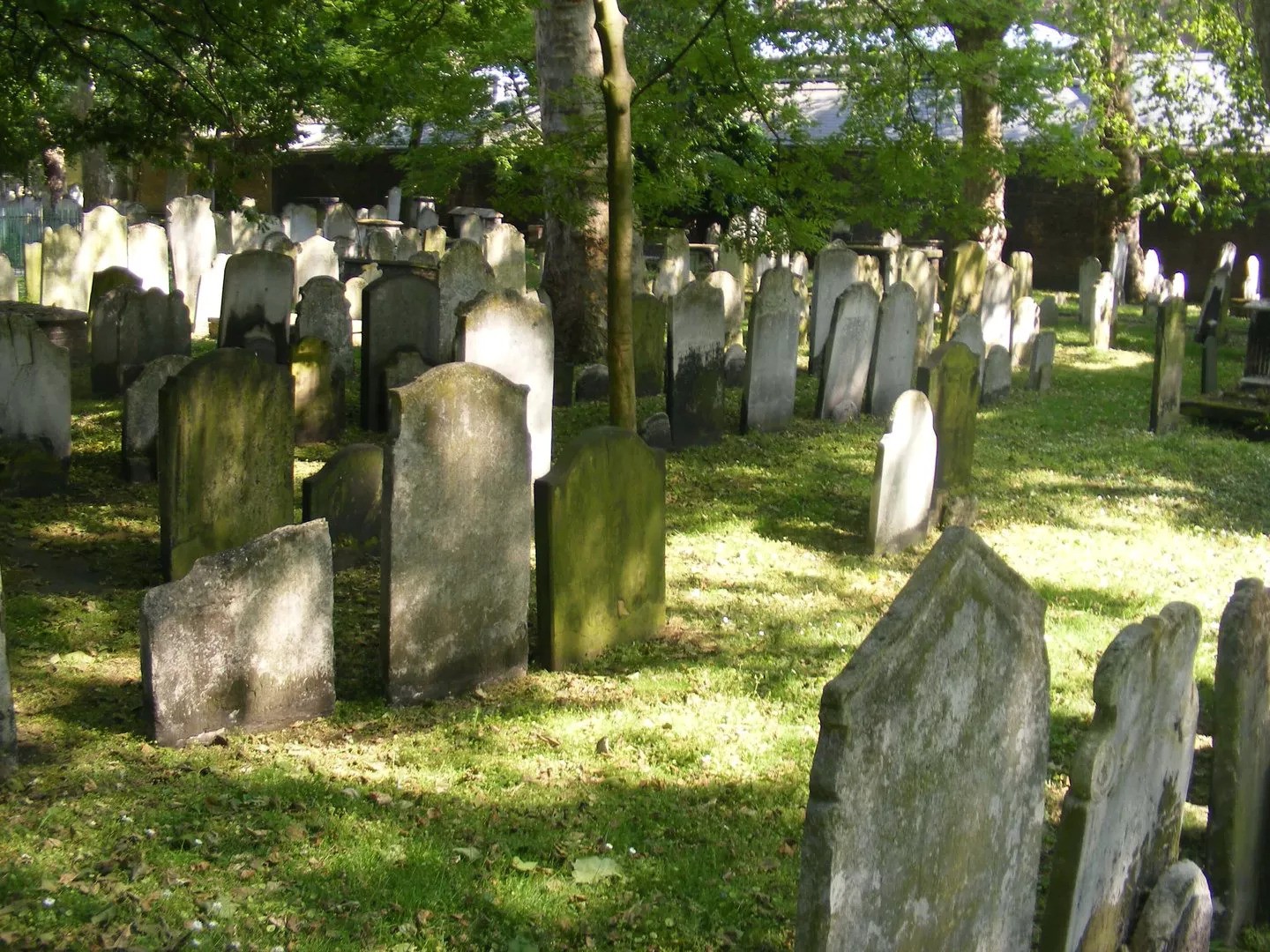 Old graveyard with mossy headstones scattered across grass at the Bunhill Fields This burial ground near Old Street contains graves of notable nonconformists including John Bunyan, Daniel Defoe, and William Blake. The grounds function as a park where office workers eat lunch surrounded by historic headstones.