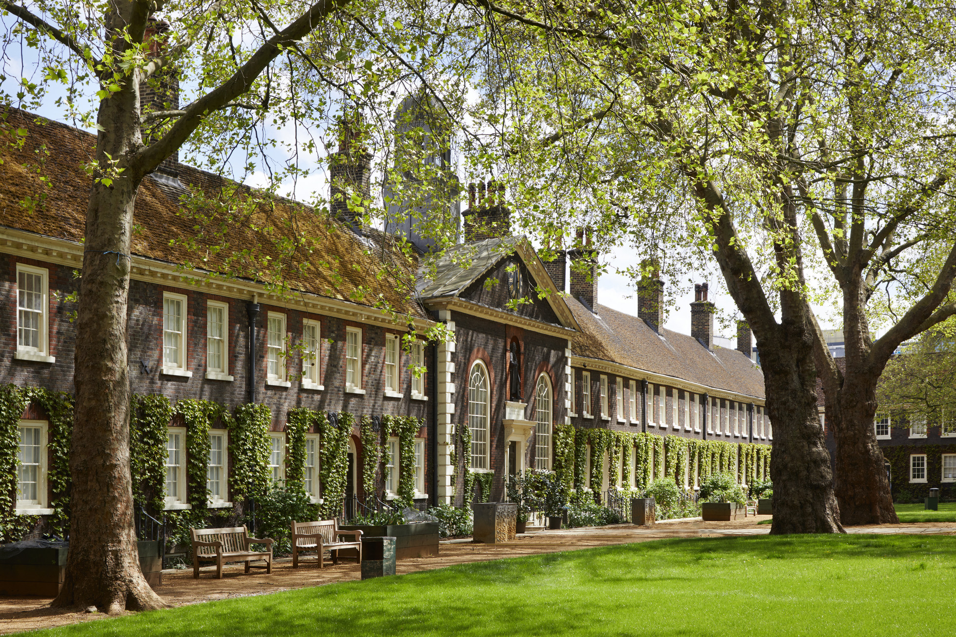 Long brick building covered in ivy with large trees nearby at the Geffrye Museum This museum in Hackney occupies former almshouses and displays how middle-class homes looked across different centuries. Period rooms recreate domestic interiors from 1630 to the present.